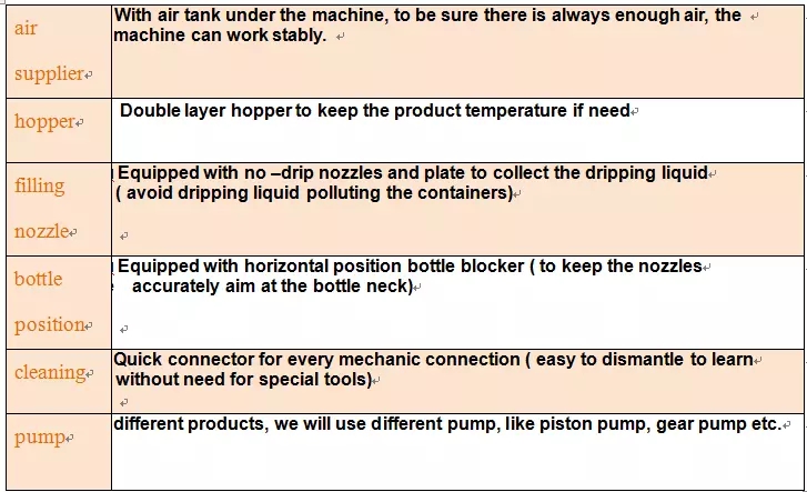 Ez a gép kifejezetten bármilyen viszkozitás / folyadék számára készült az élelmiszeriparban, a vegyiparban és az ipari termékekben, például motorolaj, motorolaj, saláta, kézmosó gél, kókuszdióolaj, szójaszósz, szezám, sampon, folyékony szappan, motorolaj , fékolaj, főzőolaj, paradicsomszósz, ital, illóolaj, növényi olaj, méz, borsszósz, földimogyoróvaj, joghurt, gyümölcslé, ital stb. A folyadékkal / szósszal érintkező rész kiváló minőségű rozsdamentes acélból áll. dugattyús szivattyút vesz fel a töltéshez. A helyzet-szivattyú beállításával az összes palackot egy töltőgépben tudja feltölteni, gyors és nagy pontossággal.
